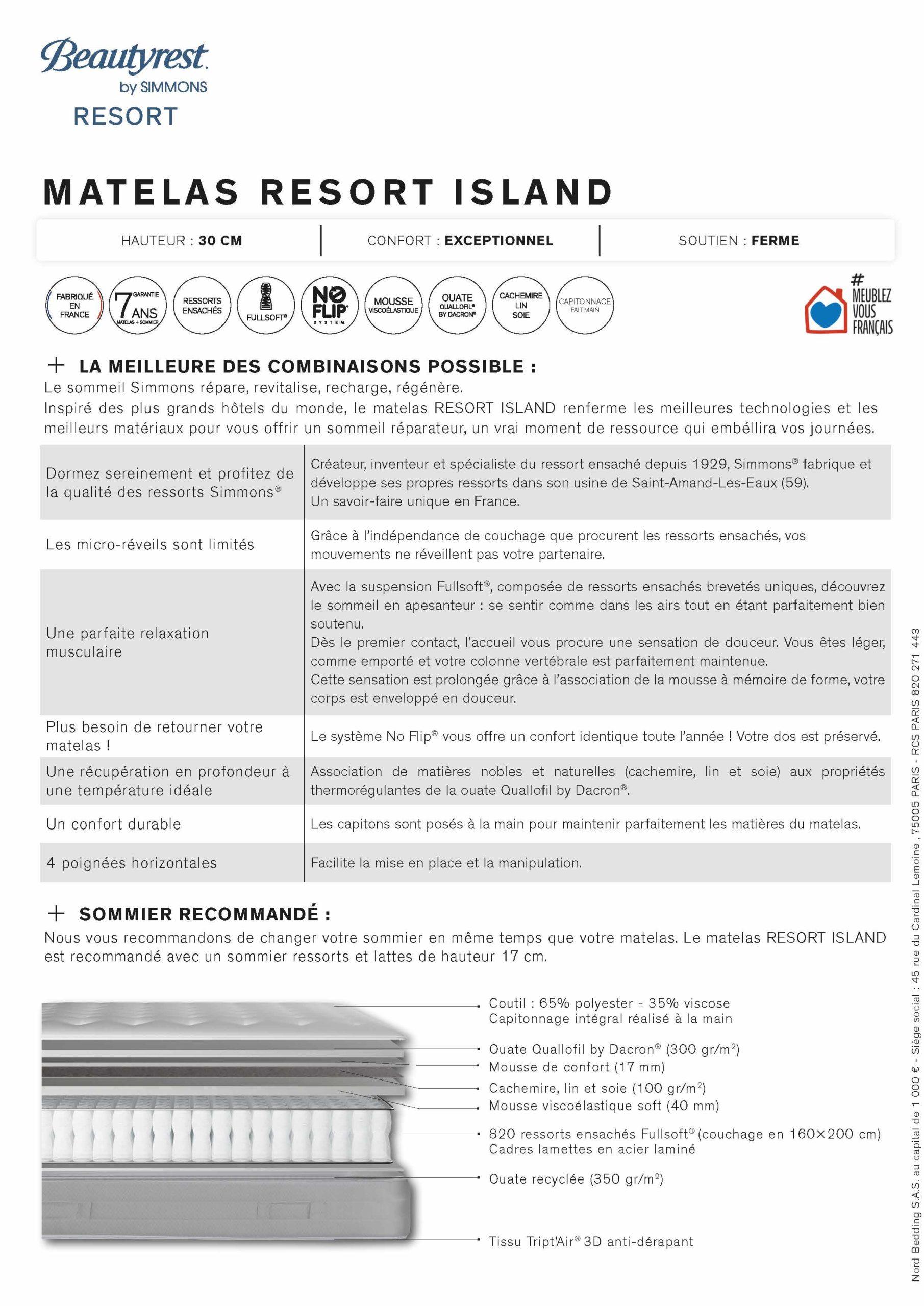 Le sommeil Simmons répare, revitalise, recharge, régénère. Inspiré des plus grands hôtels du monde, le matelas RESORT ISLAND renferme les meilleures technologies et les meilleurs matériaux pour vous offrir un sommeil réparateur, un vrai moment de ressource qui embellira vos journées.