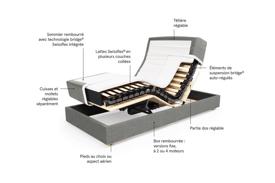 Le cœur du Swissflex® Box est le sommier à lattes rembourré avec la technologie Swissflex bridge® intégrée. Ces éléments de ressort spéciaux de bridge® s’adaptent automatiquement au corps pour vous offrir un confort de couchage paradisiaque. Avec le Swissflex® Box à 2 ou 4 moteurs, vous bénéficiez d’un confort encore plus individuel : Non seulement la tête et les pieds sont réglables, mais le haut et le bas des jambes peuvent également être réglés séparément. Vous pouvez ainsi adopter confortablement la position assise ou allongée que vous souhaitez ! Le design élégant est complété par la boîte rembourrée et les pieds de lit de votre choix – l’aspect élégant et flottant est également possible. Choisissez votre favori parmi les versions fixes, à 2 et 4 moteurs !